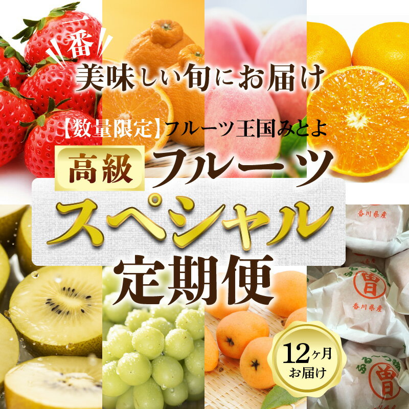 特産品詳細 特産品名【ふるさと納税】【数量限定】フルーツ王国みとよ高級フルーツスペシャル定期便(12回) 内容量 【1月中旬〜2月上旬】 ふるーつ物語 越冬完熟「袋掛けみかん」 約7kg(70〜120個程度) 【2月中旬〜2月下旬】 とろける食感「せとか」 約5kg(12〜15玉) 【3月上旬〜3月下旬】 いちご食べ比べ「さぬきひめ・女峰」 各400g化粧箱入り 【4月上旬〜5月上旬】 甘み抜群「貯蔵デコポン」 約5kg 3L〜5L(12〜18玉) 【5月中旬〜6月中旬】 ビワの新品種「なつたより」 約1kg化粧箱入り(15〜20粒) 【6月下旬〜7月上旬】 赤いみかん「ハウスさぬき紅みかん」 約2.5kg桐箱入り(25〜30玉) 【7月中旬〜7月下旬】 高糖度もも「あかつき」 約4kg化粧箱入り(10〜13玉) 【8月上旬〜8月下旬】 厳選大粒「ハウスピオーネ」 約5kg(5〜7房) 【9月上旬〜9月下旬】 厳選大粒「シャインマスカット」 約5kg(5〜7房) 【10月中旬〜11月上旬】 さぬきゴールドキウイ「黄様(おうさま)」 約4kg 6L〜7L(16玉) 【11月中旬〜11月上旬】 高糖度「温州みかん」 約10kg(S〜Lサイズ) 【12月上旬〜12月下旬】 香川県オリジナルいちご「さぬきひめ」 400g化粧箱(12〜15粒)×2箱 ※入り個数はご指定いただけません。